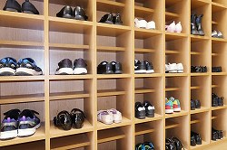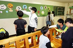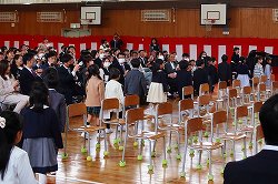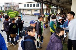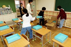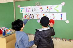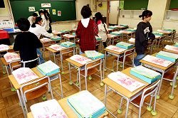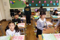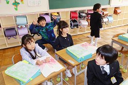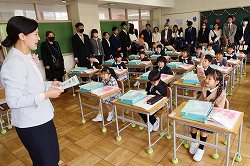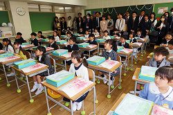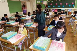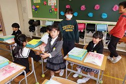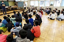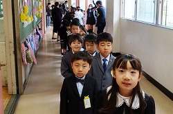 | 各学級に戻って、担任の先生のお話。みんなうれしそうです。靴のかかとも、心もそろっています。 |