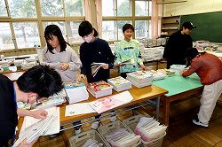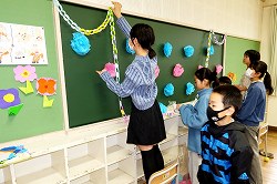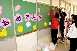| 6年生が、入学して来る1年生のために、心を込めて準備してくれました。ありがとうございます。〈1段目〉入学式準備のために張り切って登校。〈2段目〉新しい教科書やお道具箱などの用意。〈3段目〉教室の装飾も準備完了。〈4段目〉さくら学級、〈5段目〉廊下。〈6段目〉体育館。頼もしい新6年生です。今年1年、大いに期待します。