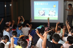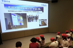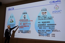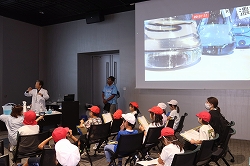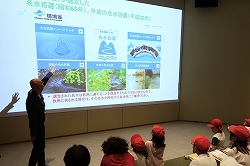 | その1。シアターで、映像を見ながら、クリタグループの沿革や水処理技術、昭島市のおいしい水の秘密などを伺いました。 |