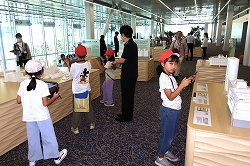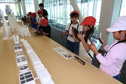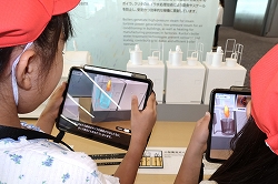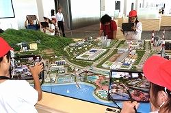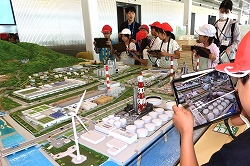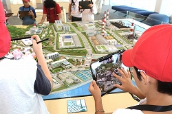 | その2。1人1台のiPadを持って工場の模型にかざす形で、栗田工業の施設や水をきれいにする仕組みなどを学びました。 |