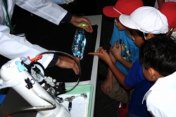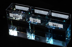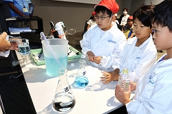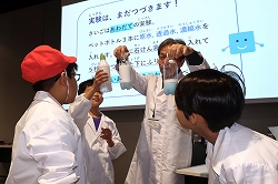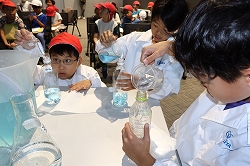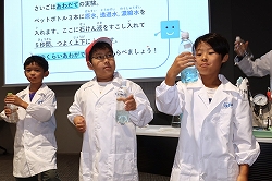 | その5。実験で分離した3種類の水(透過水、原子、濃縮水)のきれいさについて、代表児童が実験しました。 |