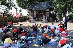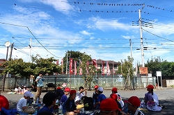 | 最後の見学の前に、おいしいお弁当タイムです。道路向こうの電線に鳩がたくさん止まっていました。 |