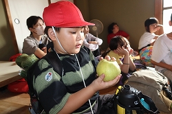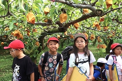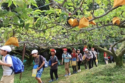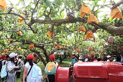 | いよいよ梨農園の見学。幸水(こうすい)、豊水(ほうすい)、新高(にいたか)など、豊かに実っていました。 |
