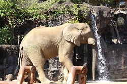 | アフリカゾウの前で記念撮影をして、ワクワクです。 |
