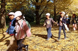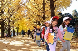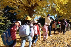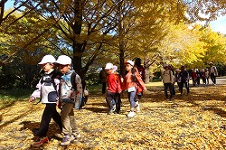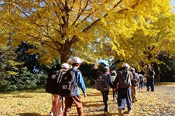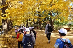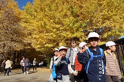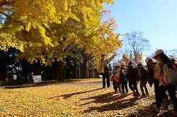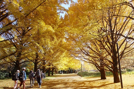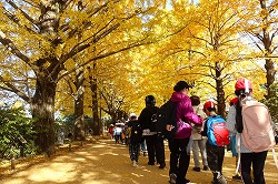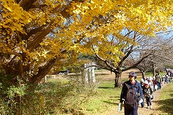 | 入園後「かたらいのイチョウ並木」。黄金色のトンネルを歩きます。 |