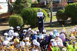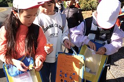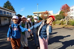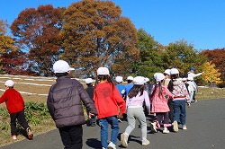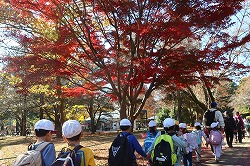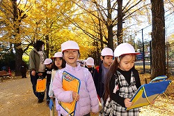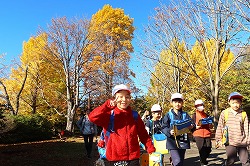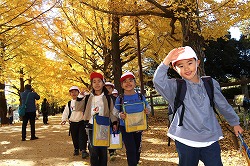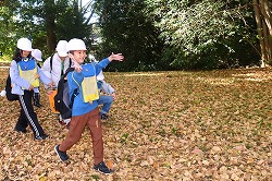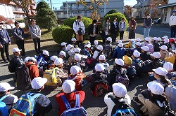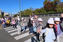 | さわやかな秋空が広がり、元気に出発。交差点では、“自分の目”で安全を確認しながら渡ります。 |
