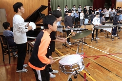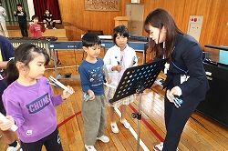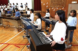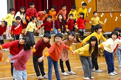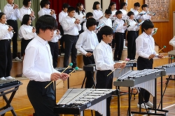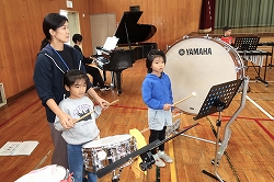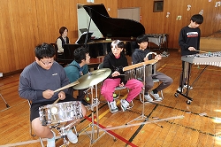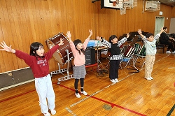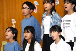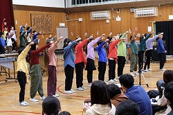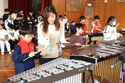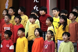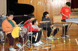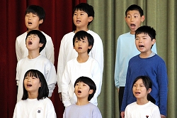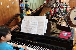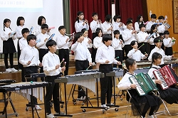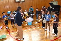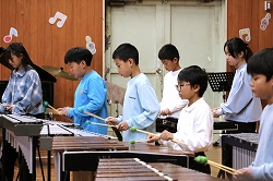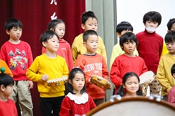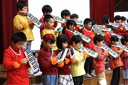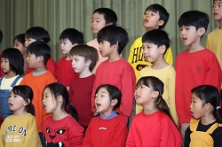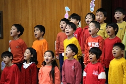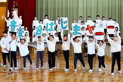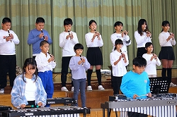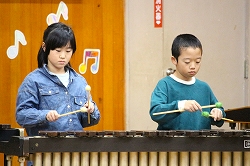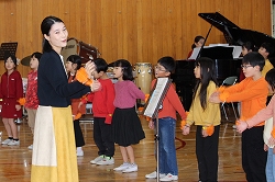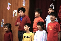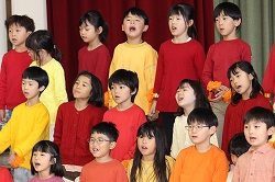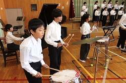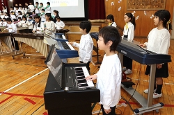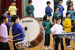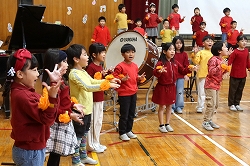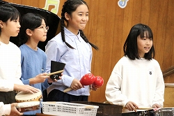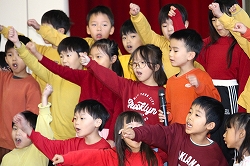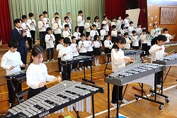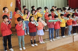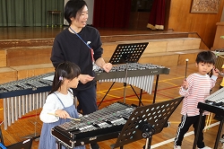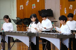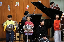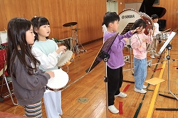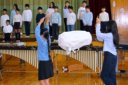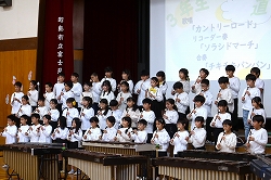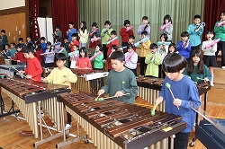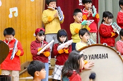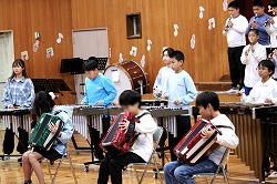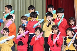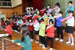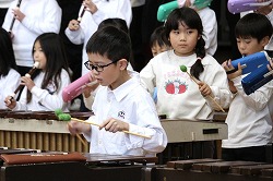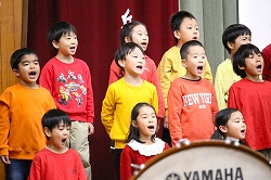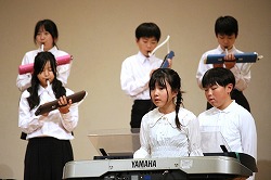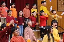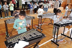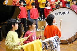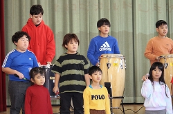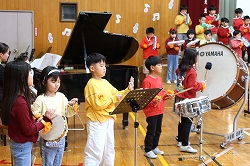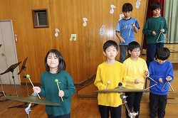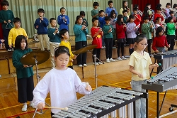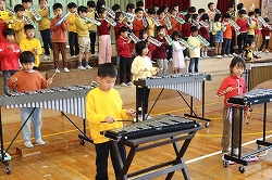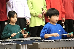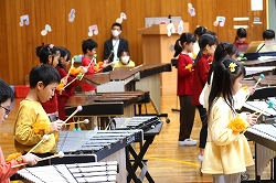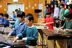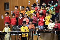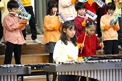 | たくさんの仲間がいる喜びを、歌と合奏で表現します。仲間の声や音をよーく聞いて、指揮者に合わせる練習をしました。鍵盤ハーモニカ、木琴、鉄琴、そして様々な打楽器の音色にもご注目ください。元気、勇気、力を合わせて頑張ります! |