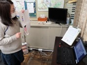 | オンライン朝会は、このような感じで行っています。発信元の機器は、教員用のPCやタブレッなど、用途に応じて工夫しています。<左>本日のオンライン朝会では「慮る」というお話をしました。<左>生活指導のお話は、ペープサートを用いて分かりやすく伝えていました。