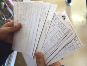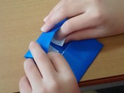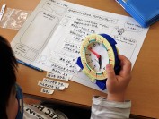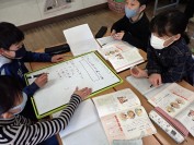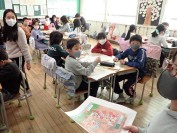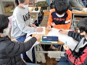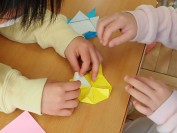 | 1年生が、クラスで折り紙を折っていました。さて、どんな形になるのでしょうか? 実は、卒業する6年生にプレゼントするメダルだそうです。毎年の恒例だそうで、1年生はウキウキ気分で取り組んでいました。