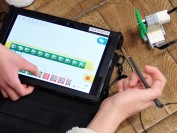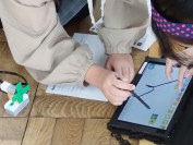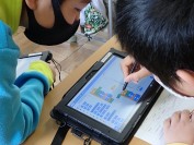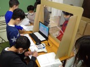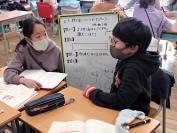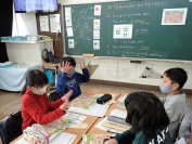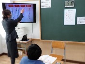 | 3組は、3つの学年から編成される複式学級であるため、1人の担任に多くの負担や困難が伴います。今日の国語は、学年毎に‘めあて’を設定して個別指導を工夫していまいた。<左>デジタル教科書を用いて、書くことのテーマ設定。<右>同時に、他の学年ではアプリで四字熟語を調べたり、文字の練習。 |