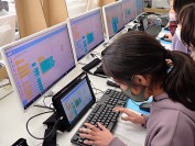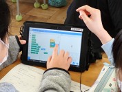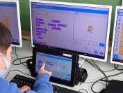 | 4年生の音楽の授業です。プログラムソフト「スクラッチ」を使って、「さくら さくら」の旋律の音色を変えたり、伴奏を付けたりました。今日は、リズムや楽器の種類を限定して、音色の組み合わせ方と順序に特化しました。既存の曲に変化を加えて新たな価値を創造するリミックスの手法にもつながります。 |