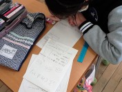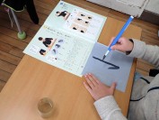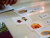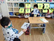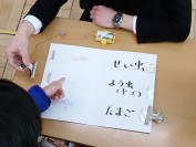 | 本時は、語彙を豊かにし、自分の経験したことや気持ちを的確に言葉で表現したり、言われたことを理解して答えたりできるように、言語の力を高める指導をしていました。 <左>季節の言葉のマッチング。特殊音節に気を付けて、正しく答えていました。<右>プラバンを実際に作成して、その説明書を書きました。 |
