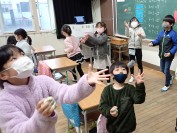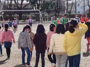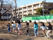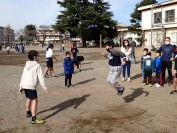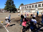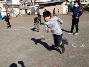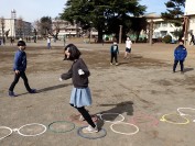 | 体育委員会の児童が、中休みの遊びをリードしていました。<左>昔懐かしい、ケンケンパです。地面に円を連ね、片足飛びと両足着地とを繰り返します。<右>郵便屋さん おはいんなさい・・・ 拾ってあげましょ 1枚、2枚、3枚・・・20枚以上跳んでいました。 |