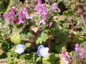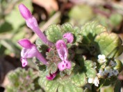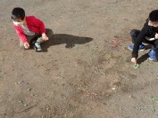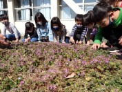 | 足元にも、小さなお花がたくさん咲いています。学級の畑には、オオイヌフグリ、ホトケノザ、ナズナ、タンポポなど、春の花がたくさん咲き始めました。<左>興味深そうに、色々なお花を探していました。<右>子供たちは、花の名前もすぐに覚えてしまいます。 |