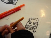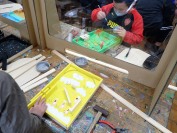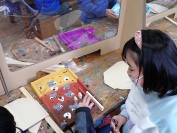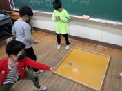 | 5年生の図工です。コリントゲーム(商標名)とは、傾斜させた盤に釘を打ち、所々に点数のついた穴をあけ、球を小棒で突いて盤上に転がし、得点を競うゲームです。これまで学んだ技法を総動員して、それぞれの空想の世界を描き、創意工夫していました。 |