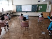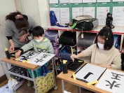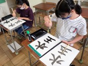 | 5校時、3年生は、密を避けるため2つの教室に分かれて、毛筆の学習をしていました。4人の先生(担任+副校長+育成教員+教育支援員)が2教室で、きめ細かく指導していました。さすがに効率よく、一枚書くごとに上達したようです。