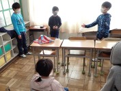| 3年1組は、「たからさがし」と「クイズとマジック」の2店です。<左>宝探しでは、教室のどこかに折り紙で作った宝を隠して見つけるゲームです。折り紙が凝っていました。<右>クイズとマジックは、2~3人のマジシャンチームが、色々なマジックを披露してくれました。