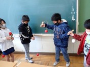| 今日は、久しぶりに本格的な雨が降り続きました。雨の日は憂鬱になりそうですが、子供たちは教室で思い思いに工夫して過ごしています。1年生の教室では、楽しく、むかし遊びに興じていました。<左>お手玉。<右>コマ回し。