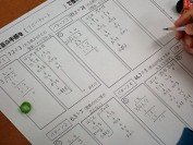 | わり算には、かけ算、ひき算、足し算など、多くのことを使う複雑さがあります。そこで、わり算の手順をフローチャートで整理することにより、大きい方の位から、「たてる→かける→ひく→おろす」の順に「分けられなくなるまで繰り返す」というプログラミング的思考につなげて理解の定着を図りました。 |