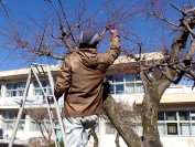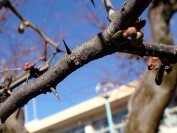 | 春になると枝いっぱいに花をつけるボケの木。<左>用務主事さんが、庭園の枝を丁寧に剪定してくださっていました。<左>伺うと、「このトゲが子供たちに危険なんです」と。気を付けないと目の高さに枝が延びてきます。校内のすべてに気を配ってくださり感謝です。