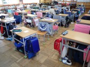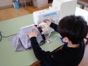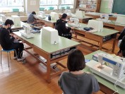 | 今日は6年生がミシンを使うということで、家庭科室をのぞいてみました。<左>しかし、広い教室に8人しかいません。三密を避けるため、他の児童は教室で、別の作業を行っているということです。<右>机の上もすっきり。安全に作業ができます。