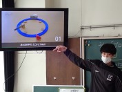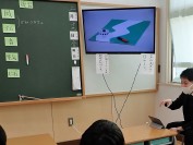 | さくら学級2組は、理科の授業です。「つくってあそぼう」と、風やゴム、音、電気や磁石の性質を利用したオモチャ作りの計画を立てていました。<左>動画を見て、イメージを膨らませます。 <右>先生の試作品です。左の絵と右の名称が一致すると電池が光ります(光るはずでした・・・)。 |
