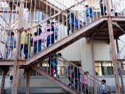 | 今日は、予告なしの避難訓練をしましたが、いつも通り、冷静に静寂の中で行動することができました。今回は、地震発生後、主事室からの火災発生の想定したので、校舎外の非常階段を使う訓練をしました。 |