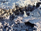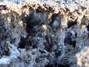 | 早朝、校庭を歩いていたら、ボコボコっと沈んで足を取られました。気温がグンと下がった校庭の広い範囲に、写真のような空間が出現。拡大すると、まるで巨大な洞穴のよう。実際は数センチ程度ですが、地面の下で氷が形成された結果として起きた現象です。