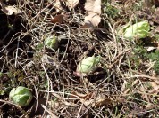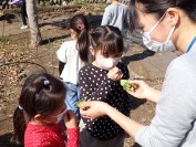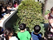 | 金曜日に紹介した「ふきのとう」を、さっそく1年生が先生と一緒に見に行きました。初めて見る子も多く、ふきのとうを知らないようでした。<左>子供だけでは立ち入り禁止の場所に「ふきのとう」が自生しています。<右>初めての「ふきのとう」の匂いを嗅ぎました。