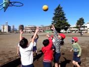 | 今日の中休みは、なぜか東西の道路側だけで遊んでいました。<左>3年生は日によってバスケットボール、サッカー、ドッチボールなど、場所によって遊びを変えています。<右>4年生は、ドッチボールをしていることが多いようです。しかも先生が見守る中、クラス全員でやっているので、体育の授業のようにまとまっています。