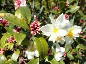 | 今日は気温がぐんぐん上がり、夏日に近い陽気となりました。玄関の花壇では、満開になった水仙と、いっきに開き始めた沈丁花が共演しています。<左>1年生が、教育支援員さんに校内の草花を案内していただきました。<右>水仙と沈丁花。