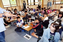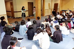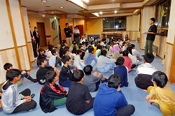 | 3日目の朝を迎えました。今朝は雨模様。朝6時起床とともに、素早く寝具をたため、あっという間に部屋の片付けをしていました。広間で朝の会。名司会の子供たちがクイズまで盛り込んでいました。 |
