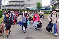 〈左〉「ただいまぁ~」、お出迎え、ありがとうございました。3日間の充実した「探究」を終え、「生き方」考えた子供たちが、一回りたくましい表情になって帰ってきました。