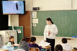 | 4年生は、総合の授業で御講演をいただいた桂 笹丸 氏にお越しいただき、子供たちの落語を実際に聴いて、アドバイスをしてもらいました。話し方や顔の表情、身振りなど、いつの間にか話の世界に惹き込まれる歯切れの良さと迫力を教わりました。 |