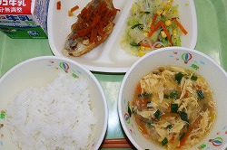 | 給食:バランスの良い食事の代表格です。どの学年も、好き嫌いをせず、残滓ゼロで、盛り盛り食べています。先生や友達と一緒に楽しく食べると、食欲も増すようです。 |