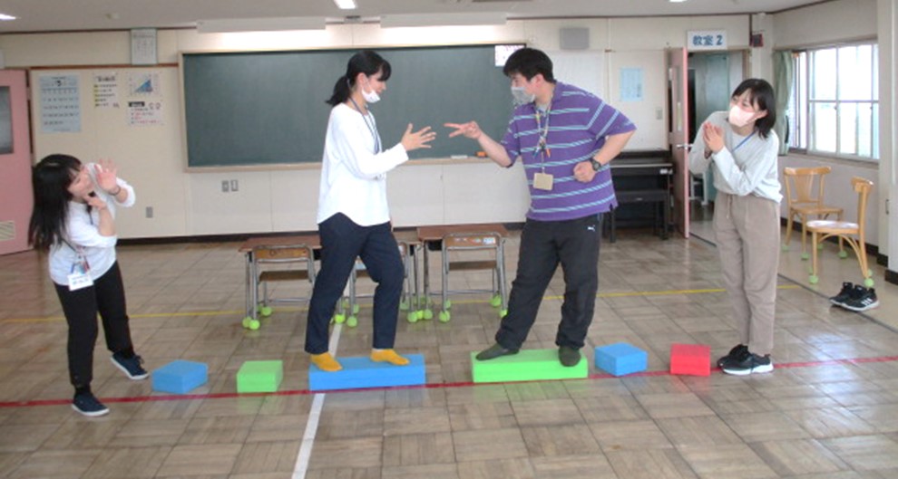 感覚統合やコーディネーショントレーニングの動きを取り入れた、たんぽぽ教室オリジナルの「やってみよう体操」に子供たちと取り組んでいます。活動前に子供たちの覚醒を上げたり、身体の動かし方を意識したりすることができるように声を掛けて指導しています。子供たちも楽しく取り組めています。