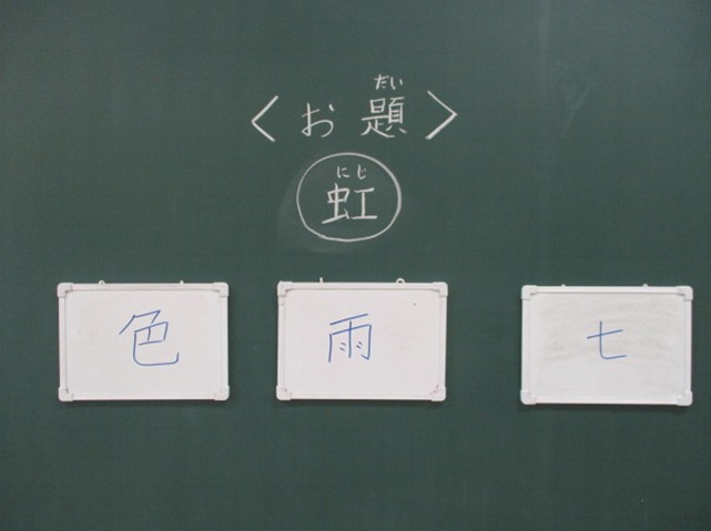 「連想漢字ゲーム」とは、お題について漢字1文字で表していき、それを見て回答者がお題は何かを当てる活動です。自分の書きたい漢字を書くのではなく、相手が答えをイメージしたり、読んだりできる漢字を考えて書くことを通して、他者意識の大切さを学びました。