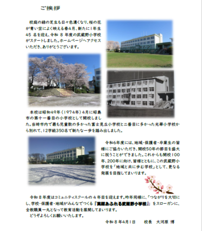 今年度も、日々の学校の様子をこのホームページでお知らせして参ります。保護者の皆様には学校でのお子さんの様子を、地域の皆様には現在の武蔵野小学校の取組を知っていただく機会の一つになればと考え、できるだけ毎日更新いたします。