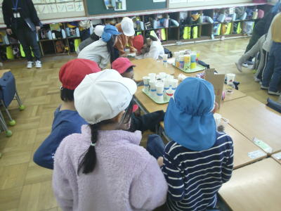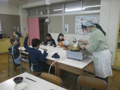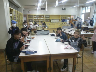1・2時間目、5年生は家庭科室で調理自習です。家庭科室に行くと既にほとんどの班が調理が完成していました。