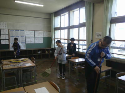 朝、5年生は昨日行われた入学式の会場だった体育館の復旧を手伝ってくれました。