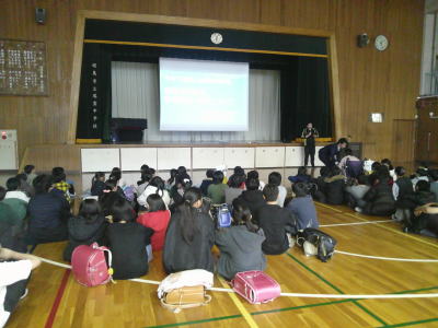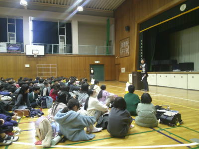 次の時間、6年生のもう一方のクラスでも実演をしていただきました。その後、体育館で改めて、みんなの将来に向けての心がまえをお話しいただきました。自分に自信をもつことの大切さ、夢や希望をもち挑戦すれば、それは必ず実現するという熱いメッセージをいただきました。