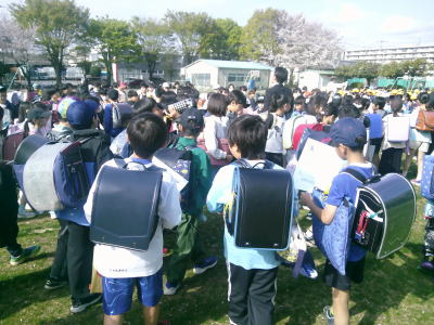 2年生から6年生の子供たちは、朝、校庭で元の担任の先生たちからクラス分け名簿をもらいました。