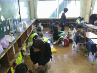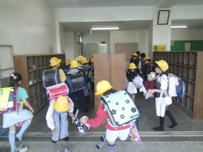 1年生が登校してきました。はじめてランドセルから勉強道具を出し、学習の支度をします。