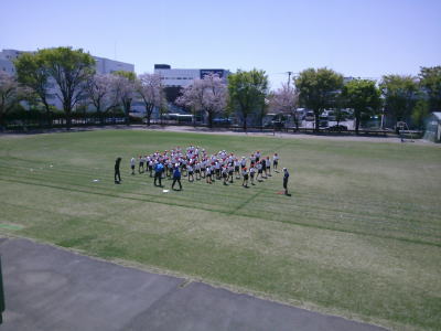 校長室から見えた5年生。こちらも学年合同で準備運動をしていました。