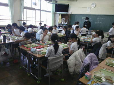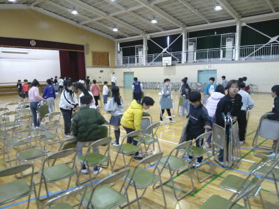 今朝は、6年生と専科の先生もお手伝いに来てくれました。準備のできた人からきちんと席に着くことができました。