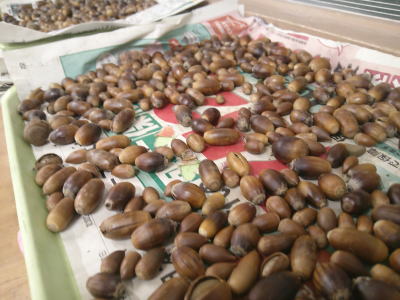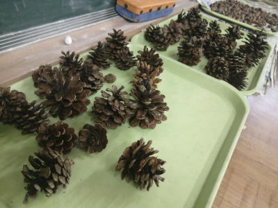 教室の後ろには、先週の生活科見学で昭和記念公園で拾ってきた松ぼっくりやドングリがたくさん干してありました。