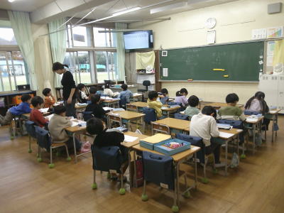 1時間目、1年生は算数で少人数に分かれて学習していました。