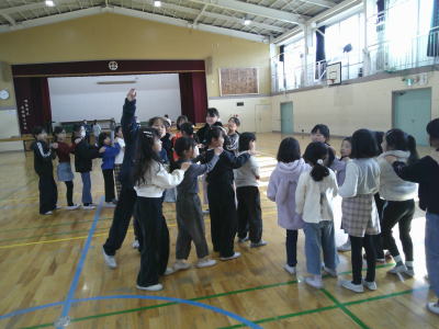 児童会主催の全校で遊ぼう企画。今日の昼休みは体育館で「じゃんけん列車」です。