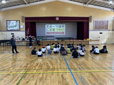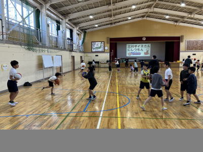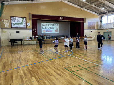 4年生の体育・バスケットボールの学習に、立川市を拠点とするプロバスケットボールチーム「立川ダイス」TACHIKAWA DICE の選手とスタッフの方が来てくれました。