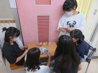 昼休みも同様でした。子どもたちはそれぞれ室内で過ごしました。この教室では先生も交えてウノをしています。